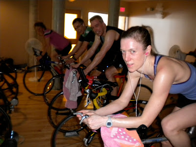 The yoga studio would be the setting for our ride, and it was suitably outfitted with a large projection screen for videos we would be watching to pass the time. The first video was UltraMarathon Man, a film documentary about runner Dean Karnazes, who ran 50 marathons in 50 states in 50 consecutive days. An incredibly inspiring story to be sure, which made my feeble little 3.5 hours on a trainer seem completely insignificant, and yet no less painful. In fact perhaps more so, considering the fact that there are few things in life I hate more than running. Hell, even with a root canal you get to lie down and drugs to numb the pain. So despite the inspiring yuddah-yuddah, I chose to listen to my Long and Slow playlist on the trusty old iPod, and chat with the folks around me. For me, that was better inspiration than watching some nut peel off his destroyed toenails. Some great company along for the ride today, and even though it was difficult to chat over the noise of the bikes and the video, it was good to be surrounded by familiar faces.