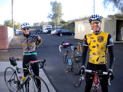 Soon after, we were on our way. The Cannondale I rented is great (despite the clownish appearance). With my own saddle on it, feels just like my bike back home. A huge relief considering the hell this week would be with an ill-fitting bike. We pumped up our tires and rolled out on a route similar to the one we took yesterday and after about 15 miles we were out of the city and surrounded by wide open vistas full of cacti of all shapes and sizes. We passed a number of groups on our way out, not really stopping to chat as we are only allowed to ride in groups of four people, max. So the four of us stuck together and enjoyed a nice easy ride with great scenery. The rest stops come every 20 miles or so, and we are fed royally on sport bars, bananas, cookies, chips, nut and beef jerky. And of course all the Gatorade you can drink.  Today there was lots of hills, big climbs, with a combined elevation of 4,000 feet. Which is about 3,900 feet more than I am used to, being from the flat, bald prairie. Plus, being a 5’10”, 150 lb. woman does not make for easy climbing. So I suffered up the hills, at times in the smallest gear I had. The upside, was ironically, the downside. On the downhills, my size proved to be an advantage, coasting easily down at awesome speeds with little to no effort. The downhills can be scary, but I concentrate on my form: loose hands in the drops, relaxed upper body, as low and small I can make my body to cut through the wind. Ben and I rode together for a while before lunch, a gradual downhill with a tailwind. Perfect conditions, and very fast. A ride I’ll remember forever.