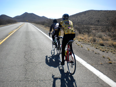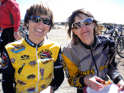 Once past the base of the mountain, the fun did not stop, with a gradual downhill and still tailwind. Flew into the lunch stop grinning like a crazy person. Lunch was fantastic to boot, with grilled cheese and tomato sandwiches, fruit salad and chips. YUM!! Have to mention the food at this point. These folks do a fantastic job of providing support for us. They set up trailers, benched, bike racks and an assortment of food and drink for us 4 times a day. Usually 2 morning rest stops, lunch and a mid afternoon stop. But god help you if you don’t wash your hands before sticking them in the chip bags, or if you pee to close to the food van. This years’ jerseys are pretty funny. Playing off the fact this is Desert Camp, the jerseys say “Dessert Camp” and feature fictional local deserts like the “Tombstone Tart” (not my new nickname, Princess Andrea still seems to be sticking, which suits me fine).After lunch, Michelle and I left Ben and Scott peeing by the side of the road (a safe distance from the food van) and took off down the road. A great downhill, reward for the awful uphill on the way there. The downhill turned to rolling hills and a side wind, but still the boys caught up at the next rest stop. The next stretch was back to Willcox and Ben and I rode like hell. It was mostly downhill and a bit of a tailwind made for a very, very fast and fun ride back to the hotel. So fantastic!!!!