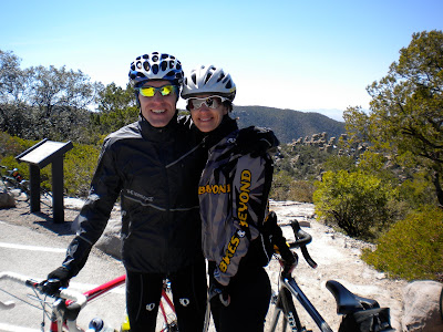 I have wondered why people around here are so religious. Everywhere you look there are crosses, churches, crucifixes and monasteries. Today we even passed a monastery/trailer park. Odd combination. Anyway, during the first 19 miles of riding into what felt like 80 km headwinds on a brutally long and straight incline, I think I figured it out. Pedaling mostly with one leg, grinding out that 19 miles, I prayed to God. In fact, I prayed to anyone who would listen. I prayed to Saint Ben to block the wind. I prayed to Saint Coach Troy for strength. And I prayed to Saint Chris Charmichael for proper pedal mechanics. I’m not sure if any of them heard me, but when we finally reached the first rest stop I thanked them all. We had rolled out late, and given the not-so blistering pace, Lon told us we would likely not make the cut- off time to climb the monument (basically a mountain). So came the agonizing decision of what to do. My knee was still killing me, so it was either hitch a ride to the base of the monument, and do the climb, or ride the 14 miles to the base and turn around back to Willcox. I chose the former, and the decision killed me. Getting into the van, with my bike in the back was so depressing I felt like crying, but in the end listening to my head, rather than my heart was absolutely the best thing to do.I unhappily rode the van to the second check stop 14 miles away and sulked in the van with warm day-old coffee, kindly offered by Susan. Oddly the coffee was way better than the shitty hotel coffee, and deeply appreciated. I had some snacks and rested the leg for a while, until it was time to head up the monument. There was a 3 mile ride to the base, followed by an 8 mile climb. After 3 miles, I honestly wasn’t sure if I could do it. But in the end, stubborn stupidity prevailed and Michelle and I headed to the top. It was a brutal climb, so steep I ran out of gears and just had to muscle my way through. I sweat and swore and pedaled for all I was worth. Stopping would have certainly rolled me and my bike right back to the bottom. But after what seemed like an eternity, we finally reached the summit and it was worth ever minute. The view was spectacular, but the feeling of accomplishment was even better. I’m sure I wouldn’t have made it if Michelle hadn’t been there with me. We chatted and joked on the way up, when breath permitted. And maybe swore a bit.