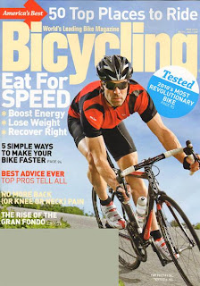 I just picked up the latest issue of Bicycling magazine and low and behold, there is my new boyfriend Mr. F1 staring back at me from the cover in all his sexy glory. Never mind the steely jawed bozo they have riding him in the attack pose typical to Bicycling covers (why do they DO that? Aren’t there any other cool bike poses?). The bike review in Bicycling says to “buy this bike if you want a light, fast, great-riding race bike with a smart build”. Duh. Light, fast, smart, great… these are all very good words.