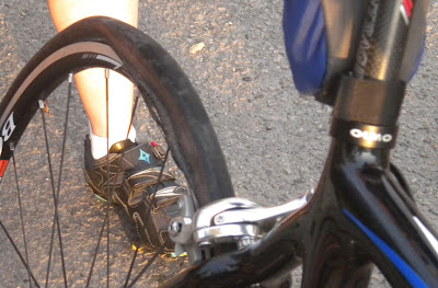 Lovely sunset ride this evening, uneventful but for an epic (yes epic) flat tire suffered by our local news celebrity Chris Harrington. The tire blew with such force that it was torn to shreds, rendering the bike completely un-operational.