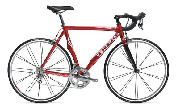 Today was a Very Special Day. Even more special than the day I fit into the same size jeans I wore when I was 17 (ok that day has not happened yet, but when it does it will be a Very Special Day too). For the first time EVER I got to ride a real bona fide carbon fiber (or fibre for us Canadians) road bike. Yes, that’s right, one of my friends actually trusted me with his bike, which he may be selling once he gets something even newer and fancier. It’s a 2006 Trek Madone 5.5, with Bontrager carbon handlebars, Dura-Ace 7800 shifters, brakes and derailleurs, Altegra 6700 compact crank and (most importantly) sparkly candy-apple red paint. It looks something like this: